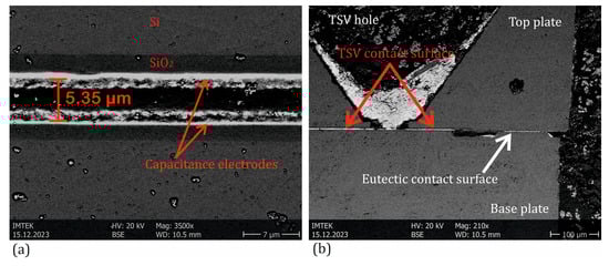 Microscopic cross-sectional image of a manufactured absolute pressure sensor. (a) The electrode distance. (b) A TSV, the TSV bonding area, and the eutectic bonding area.