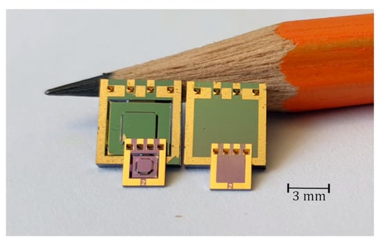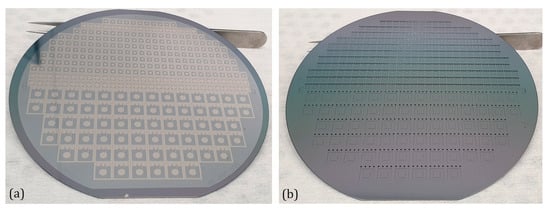 With the described design and manufacturing method, two different sensor sizes were produced. A significant advantage of this manufacturing process is that it is independent of the design parameters. This means that in a batch, different sensor designs for various measurement ranges can be manufactured. To illustrate the flexibility of the manufacturing process, the two different sensor dimensions with different sensor designs were produced on the same wafer pair, as shown in Figure 11 and Figure 12. Each wafer contains two sensor sizes: the top side of the wafer has sensors with dimensions of 3 mm × 3.8 mm, while the larger sensors, measuring 6 mm × 6.8 mm, are located on the bottom side. The sensor designs differ in the shape of the electrode (round or square) and the membrane structure (with or without anvil). In addition to sensor dimensions, the measurement range can also be adjusted by the membrane thickness.