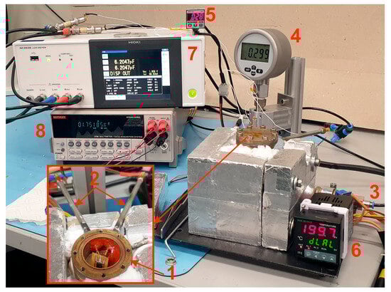 Test setup with (1) pressure chamber with the sensor inside, (2) coaxial feedthrough contacts, (3) pressure inlet, (4) Digi-04 DM-04 pressure sensor, (5) SUNX DP2-22 pressure sensor, (6) temperature controller, (7) LCR meter, and (8) Pt1000 readout.