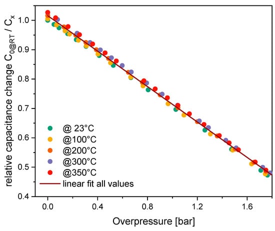 Despite the simple design and potential sources of error caused by heating of the setup components, the measurement results remain consistent over extended periods, delivering promising outcomes. The inverse capacitance vs. pressure curves were recorded at 23 °C, 100 °C, 200 °C, 300 °C, and 350 °C. The results demonstrate a high degree of linearity, with 99.993% at room temperature (RT) and 99.994% at 350 °C, over a range exceeding 100% of the initial capacitance change (Figure 15). The initial capacitance (C0@RT) is 11.165 pF, reaching 23.614 pF at 2.763 bar FS at RT, resulting in a sensor sensitivity of 3.342 pF/bar. The temperature coefficients are −0.0066%/K under no load and −0.0164% FS/K at full load at 350 °C.