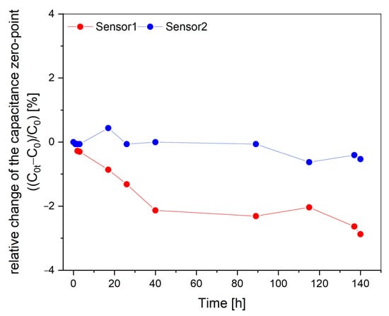 This process involved repeated rapid cooling and reheating, subjecting the sensors to significant mechanical and thermal stress. Despite these rigorous conditions, the measurements yielded promising results. The same LCR meter and parameter settings from the previous measurement were used for consistency. The relative change in the zero-point capacitance after 140 h at 350 °C was less than −3% for sensor 1 and even far below −1% for sensor 2, demonstrating the sensor’s robust performance and thermal stability. The capacitance decreased slightly over time for both sensors.