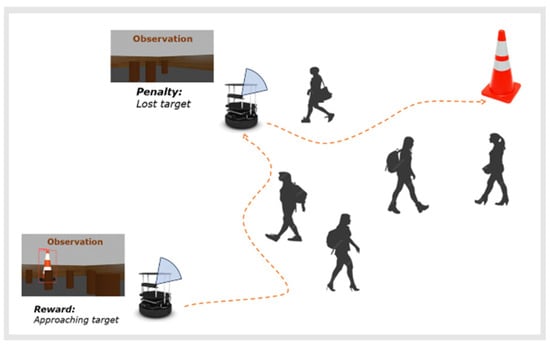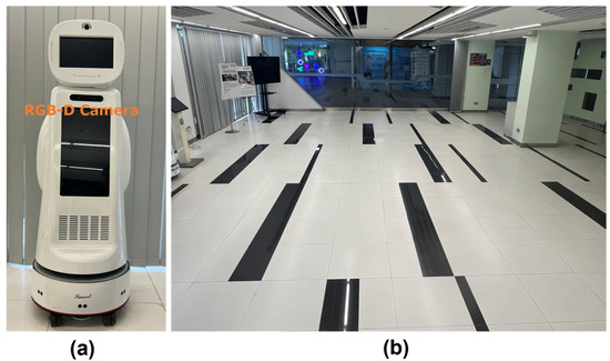 Figure 10. The robot was equipped with an RGB-D camera, which provided a 70-degree field of view, and operated under ROS Noetic. The experiments were carried out in a 9.5 m × 7 m indoor environment, with the robot and the target positioned at opposite ends of the area. To simulate a dynamic environment, five pedestrians were included, moving at typical walking speeds to represent moving obstacles. The safety cone served as the visual target for the robot.