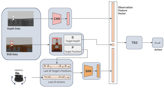 Figure 2, integrates several components, including depth data processing via a convolutional neural network (CNN), YOLOv5-based target detection, a SAN for temporal feature extraction, and TD3 algorithm for policy learning. Collectively, these components form a robust framework for visual target-driven robot navigation in crowded environments.