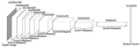 720 pixels), representing the 3D structure of the environment, are processed through an eight-layer CNN, as shown in