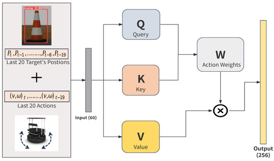 where the robot’s input sequence (i.e., past target positions and actions) is transformed into three distinct matrices—Query (Q), Key (K), and Value (V). Queries assess relevance, Keys represent the elements being attended to, and Values provide the actual data being aggregated. This allows the robot to focus on the most critical parts of its environment and adjust its behavior accordingly, despite the limited FOV.