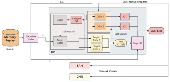 Building on the feature extraction capabilities of the CNN and SAN, TD3 is employed as the core policy learning algorithm to manage continuous action spaces in the crowd navigation task. TD3 enhances stability by using twin critics to reduce Q-value overestimation and delayed policy updates to improve training efficiency [