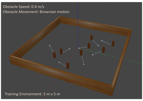 These obstacles are cylindrical in shape with a height of 0.24 m and a radius of 0.05 m, exhibiting random Brownian motion with a maximum linear speed of 0.4 m/s. The autonomous robot, a TurtleBot Burger equipped with an Intel RealSense D435 depth camera, was tasked with navigating this environment. The robot’s mobility constraints were set with a maximum linear velocity of 0.55 m/s and a maximum angular velocity of 0.15 rad/s. The depth camera provides both depth and visual input, which are subsequently processed to extract crucial environment information for navigation.