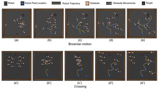 Figure 8 illustrates a typical trajectory of a robot navigating a 5 m × 5 m simulated space populated with eight cylindrical obstacles, each measuring 0.24 m in height and 0.05 m in radius. These obstacles are programmed to move in patterns of Brownian motion and crossing motion, with a maximum velocity of 0.4 m/s. The robot leverages its RGB-D camera to capture frames representing its state, comprising both RGB and depth data, at successive time intervals as it progressively navigates toward the target in a dynamic environment. The variations in the trajectory confirm the robot’s real-time adaptability to the movements of the obstacles, demonstrating the effectiveness and flexibility of the self-attention enhanced DRL approach in complex navigation tasks.