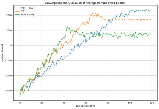 This configuration exhibited stable convergence throughout the training period. Initially, the reward values progressively increased from −3000, approaching a level of approximately 2000 within the first 90,000 episodes. After this phase, the reward plateaued around 2300, indicative of high performance and long-term stability.