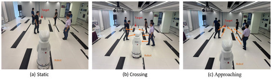 Three distinct scenarios were tested to evaluate the performance of the trained policy: (a) pedestrians standing randomly along the pathway from the robot to the target without movement; (b) pedestrians positioned on either side of the pathway, with some crossing the pathway; and (c) pedestrians positioned on either side of the pathway, with some walking toward the target. The experimental setup is shown in
