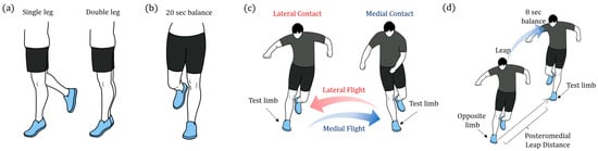 Illustration of experimental procedures. Four categories of selected functional assessment tasks are depicted: (a) Single-leg and double-leg heel raises. (b) Single-leg stance performed on the ground and foam, each lasting 20 s. (c) Side hop performed for each leg, involving four phases: lateral contact (LC), medial flight (MF), medial contact (MC), and lateral flight (LF). (d) Dynamic leap and balance involving jumping to the posteromedial direction with the opposite limb, landing with the test limb, balancing for 8 s, and leaping back to the initial position.