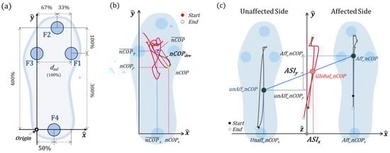 Schematics of the smart insole and indices related to FSR signal. (a) Layout of the four FSR sensors embedded in the smart insole system. The distance between F2 (toe) and F4 (heel) is four times the distance (dml) between F1 (medial) and F3 (lateral) sensors. (b) The trajectory of is represented by a red line. is defined as the distance between the mean position of and of each data frame. (c) Definition and illustration of the asynchrony index (). The global normalized COP (), shown as a red line and circle, was calculated based on each limb’s (gray line and circle) and the ratio of foot pressure. is defined as the x-coordinate of , and is determined by the difference between the COP y-coordinates of each limb ().