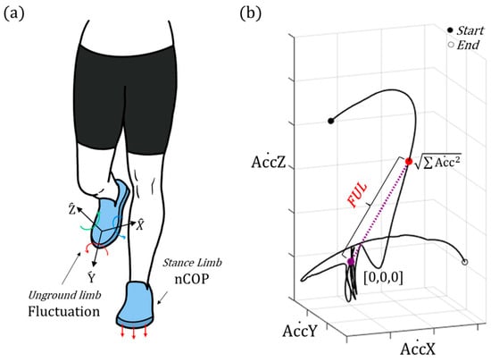 To assess stability during single-leg balancing tasks, we propose new metrics that quantify the fluctuations of the ungrounded limb (), as illustrated in Figure 3. has two components calculated by differentiating the acceleration and angular velocity obtained from the IMU sensors (Equations (7) and (8)).