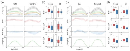 Figure 4a presents data from both the CAI and control groups during the SHR task, represented by lines and shaded areas that indicate mean values and standard errors, respectively. The x-direction acceleration () displayed in the third row represents the frontal plane motion of the foot, with negative and positive values corresponding to inversion and eversion, respectively. On the affected side of the patient group, an inclination towards the medial side can be observed, with an MPP value exceeding 0.5, accompanied by a flat curve near 0. Conversely, in the dominant limbs of the control group, the MPP values fluctuated around 0.5, with a slightly inverted foot position. The quantitative group statistical analysis performed on the MPP values (CAI: 0.63 ± 0.15, Control: 0.49 ± 0.19, p = 0.031, effect size = 0.82) shows significant differences between patients and the control group (Figure 4b). While the SI values for MPP and were statistically similar, we observed a significant difference in the values (CAI: −3.44 ± 10.32, Control: 5.26 ± 11.55, p = 0.034, effect size = 0.79).