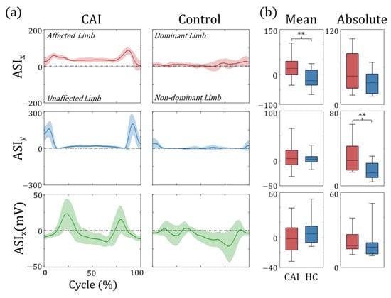 Figure 5 presents representative plots of the values during the DHR task for subjects in the CAI and control groups. In the patient data, a positive was observed throughout the entire phase, indicating that weight was consistently shifted towards the affected side. For , there were two positive peaks, where the first peak indicated that, at the beginning of the heel raise, the COP of the affected leg moved towards the toes ahead of that of the unaffected leg. The second peak suggests that the heel of the unaffected leg hit the ground prior to that of the affected side. In contrast, the of the healthy control group remained near 0 throughout the phase, indicating that both feet were well synchronized. Statistical analysis identified significant differences in the mean (CAI: 24.08 ± 38.39, Control: −14.17 ± 30.73, p = 0.005, effect size = 1.10), indicating that weight was generally shifted to the affected side for patients with CAI (Figure 5b). Moreover, the absolute values of (CAI: 32.22 ± 16.32, Control: 16.64 ± 8.77, p = 0.002, effect size = 1.19) were significantly higher in the patient group, while mean values did not show any differences. This suggests that, although there was no consistent pattern of balance shifting to one side, the degree of AP directional imbalance was notably larger in the patient group.