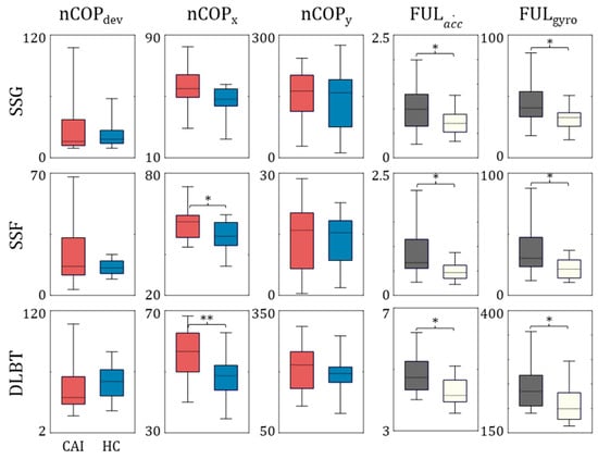 The SSG, SSF, and DLBT tasks were analyzed using the trajectory and indices, which were calculated from the FSR signals of the supporting foot and IMU signals of the lifted foot, respectively, as shown in Figure 6. Larger values for both and indicated increased postural fluctuations, suggesting decreased stability and whole-body balance control. The level of difficulty for SSF and DLBT is expected to increase due to the soft foam and dynamic leap, respectively. For , we only observed significant differences in values for both SSF (CAI: 55.18 ± 7.83, Control: 48.43 ± 8.15, p = 0.044, effect size = 0.84) and DLBT (CAI: 54.02 ± 8.59, Control: 45.27 ± 8.33, p = 0.011, effect size = 1.03), while significant increases were observed for across all three tasks, with relatively larger values for DLBT (CAI: 4.82 ± 0.63, Control: 4.27 ± 0.49, p = 0.021, effect size = 0.97) compared to SSG (CAI: 0.86 ± 0.47, Control: 0.54 ± 0.21, p = 0.030, effect size = 0.88) and SSF (CAI: 1.01 ± 0.44, Control: 0.72 ± 0.28, p = 0.049, effect size = 0.79). values for SSG (CAI: 45.69 ± 18.98, Control: 32.12 ± 10.65, p = 0.023, effect size = 0.88), SSF (CAI: 37.31 ± 19.35, Control: 22.14 ± 8.76, p = 0.011, effect size = 1.01), and DLBT (CAI: 246.81 ± 50.38, Control: 208.23 ± 39.21, p = 0.023, effect size = 0.85) also showed statistical differences.