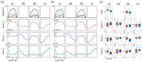 Consistent with the MPP results, we also observed an increase in the roll angle, which indicated decreased inversion during the MC phase for patients with CAI. However, because the gyroscope sensor is only installed inside the insole, the estimated angles represent the relative orientation of the foot in the global frame and not the relative tibia-foot angle. Thus, the displayed patterns and absolute values of foot orientation may differ from those of previous kinematic studies [,] that reported the actual ankle joint angles. Although no studies have reported the kinematics along the axial plane of motion, we observed significant differences in the yaw angle. In patients with CAI, increased external rotation in the post-landing state during the LC phase was noted, providing advantages for activating the peroneus longus muscle. The eccentric contraction of this muscle can resist excessive inversion during lateral cutting.