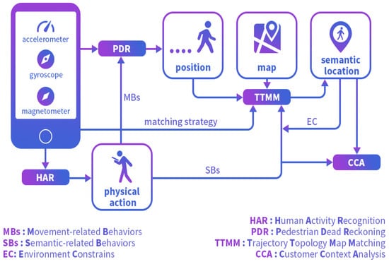 We are attempting a smartphone-based approach to capture more complex customer semantics combining with location, rather than just location-based data. The development of activity recognition technologies in recent years supports this effort. Refs. [,,,] have used deep learning methods to recognize movement-related behaviors, and we believe that such activities can be beneficial for assisting pedestrian localization. Refs. [,,,,] have proposed the recognition of daily activities, enhancing the semantic understanding of activities. Previous work [] has distinguished between simple and complex activities, further enriching the semantics of the activities.