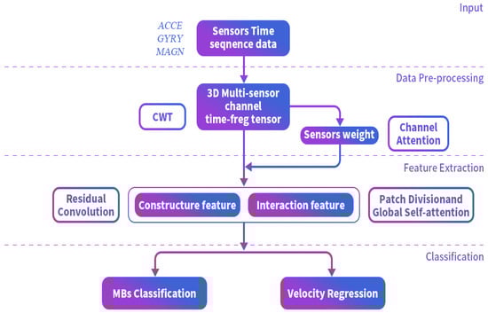 Specifically, as illustrated in Figure 5, data are input in the form of short time-windows, with each segment transformed into a time-frequency spectrum using the Continuous Wavelet Transform (CWT). In Branch 1, the MBs-Network extracts features from the short time-window data, employing a parallel structure that combines channel attention-CNN and global self-attention. According to Equation (1), the multi-task output layer performs basic MBs prediction and speed regression.