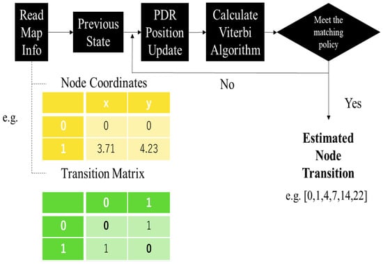 In our task, the classic Viterbi algorithm is used to obtain semantic location with node-level accuracy. We formulate map matching as a HMM. The position is recorded after the map is successfully matched at step . The PDR system accumulates position updates at a constant frequency (1 Hz, e.g.), and we calculate the transition probability using and the accumulated position change . When the Transit Probability (TP) exceeds a threshold T, the match is considered successful, and the position is updated to .