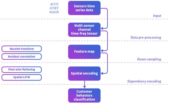 Preliminary research attempts to capture customer trajectories and routes in large shopping centers by using sensors associated with users, such as smartphones (e.g., inertial sensors, Wi-Fi, etc.), aiming to determine the time customers spend in different stores based on their trajectories, which can then be used as an indicator of user preferences [,]. However, this location-based approach struggles to capture sufficient semantic information. Subsequent studies have tried using densely deployed surveillance cameras [] or radio frequency identification [,,,,] technology to monitor shopping behavior, providing rich semantic content. However, these vision and RFID-based methods are heavily reliant on preinstalled environmental sensors, which restricts the application of customer behavior capture to specific retail stores, making it difficult to scale up across large shopping centers.