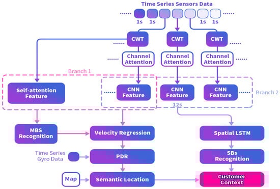 Customer context analysis (CCA) in brick-and-mortar shopping malls can support decision makers’ marketing decisions by providing them with information about customer interest and purchases from merchants. It makes offline CCA an important topic in marketing. In order to analyze customer context, it is necessary to analyze customer behavior, as well as to obtain the customer’s location, and we propose an analysis system for customer context based on these two aspects. For customer behavior, we use a modeling approach based on the time-frequency domain, while separately identifying movement-related behaviors (MB) and semantic-related behaviors (SB), where MB are used to assist in localization and the positioning result are used to assist semantic-related behavior recognition, further realizing CCA generation. For customer locations, we use a deep-learning-based pedestrian dead reckoning (DPDR) method combined with a node map to achieve store-level pedestrian autonomous positioning, where the DPDR is assisted by simple behaviors.