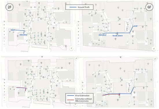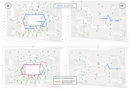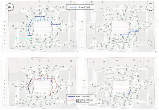 where denotes the 2d position of time step i. Each time the algorithm starts, an attitude initialization process is performed, during which the initial heading, pitch, and roll angles are obtained. We use the map’s semantics to acquire the initial heading angle, setting the starting point of the customer’s trajectory at the elevator/escalator or the shopping mall entrance, where the initial heading angle can be easily determined. At the same time, the horizontal leveling matrix of the accelerometer is used to align the roll and pitch angles, a process that requires the sensors to remain stationary for several seconds. After obtaining the initial attitude, the heading angle can be estimated in real time during the subsequent process.