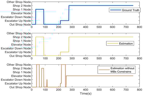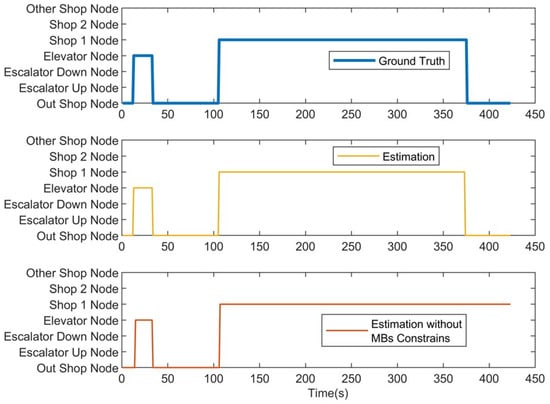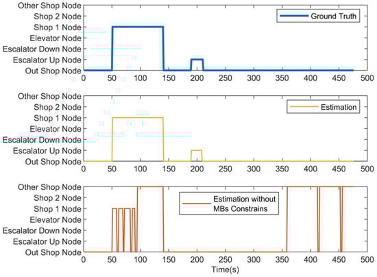 Additionally, in Trajectories 2 (Figure 7, Figure 10 and Figure 13) and 3 (Figure 8, Figure 11 and Figure 14), we observed occasional confusion between “escalator up” and “escalator down” while on an escalator. This is because, during stable escalator operation, no detectable acceleration is present, making it challenging to determine the movement direction. In contrast, within an elevator, the sensation of weightlessness during ascent and increased weight during descent is distinct, which is reflected in improved classification performance. This unique physical feedback aids in more accurately distinguishing upward and downward movements, enhancing the model’s ability to correctly identify these behaviors. According to Equation (6), the behavior sequence estimation accuracy for the three trajectories is as follows: Traj1: 85.66%, Traj2: 84.11%, Traj3: 90.54%.