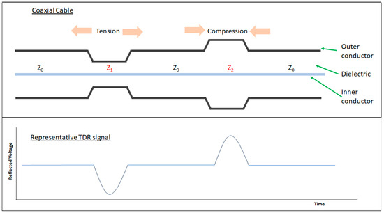Illustration of the principles of coaxial cable time domain reflectometry (CCTDR) adapted from [48,53], showing a cross-section of a coaxial cable experiencing tension and compression and the associated time domain reflectometry signal.
