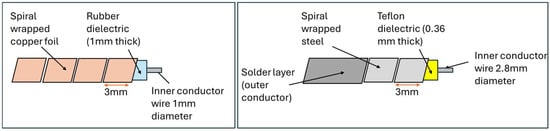 Schematic of a rubber dielectric coaxial cable structure and a Teflon dielectric coaxial cable, both with spiral-wound outer conductors for increased TDR sensitivity [72].