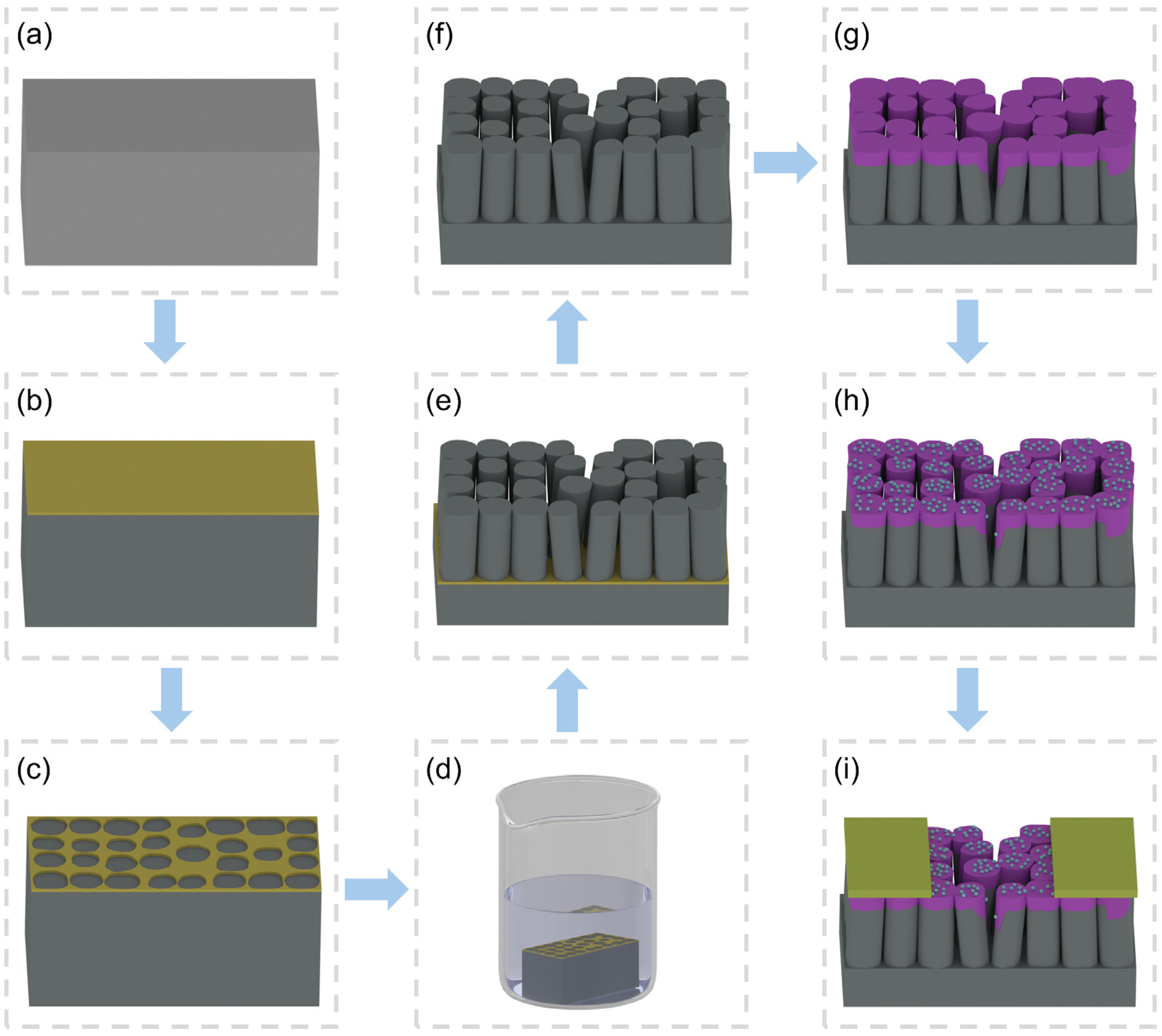 Schematic illustration showing the fabrication process of Pd-decorated SnO2 Nanofilm on SiNW substrate. (a) A rinsed p-Si slice, (b) 30 nm-thick silver film deposited by electron beam evaporation, (c) a nanostructured silver holey mask by annealing, (d) the sample under the process of MaCE, (e) SiNW substrate with Ag nanoparticles remained after MaCE, (f) SiNW substrate after removing Ag nanoparticles, (g) 40 nm-thick SnO2 film deposited by electron beam evaporation, (h) 1 nm-thick Pd film deposited by electron beam evaporation, and (i) Ag electrodes deposited by electron beam evaporation.