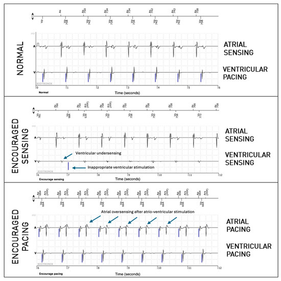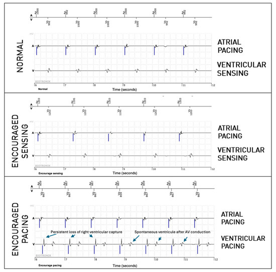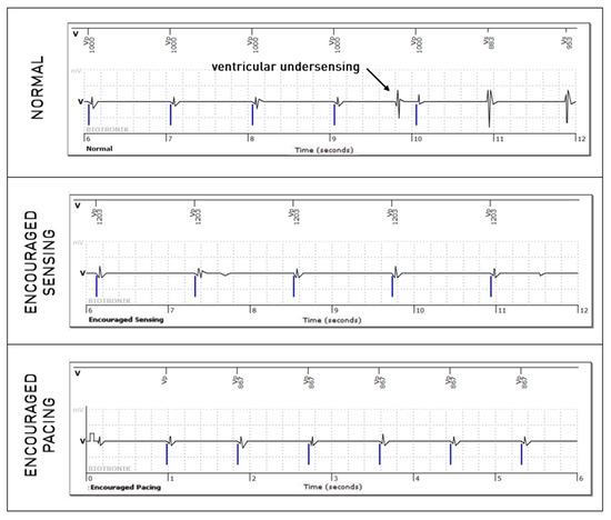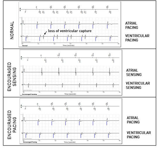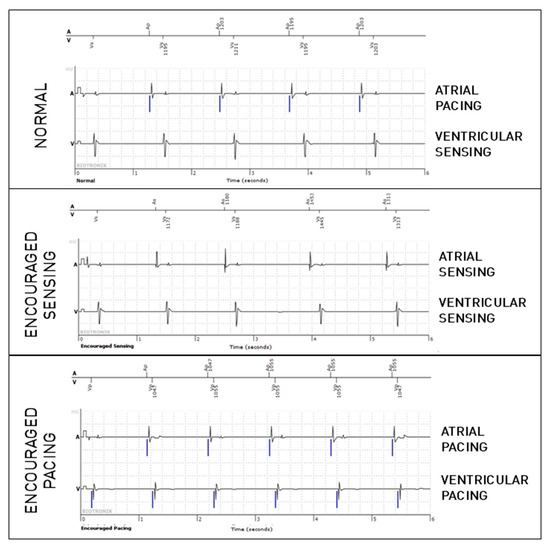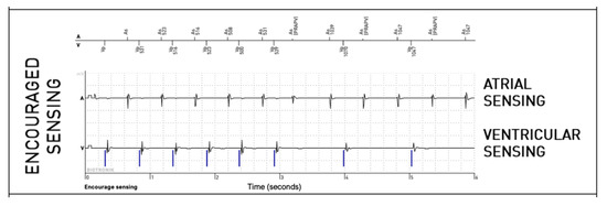 The periodic EGMs analyzed in this study are 36-second registrations consisting of three 12-second parts. The first part consists of an EGM in normal operation without programming changes (passive mode). The second part is registered during “Encouraged Sensing”, lowering the pacing rate and lengthening the atrioventricular (AV) delay according to the programmed lower rate and AV delay hysteresis, enabling the evaluation of sensing. If no hysteresis is programmed, the lower rate is decreased by 10 beats per minute, and the AV delay is lengthened by 70 ms to allow the spontaneous rhythm to appear. The third part corresponds to the “Encouraged Pacing” mode. The device increases its pacing rate by 12.5% and reprograms a short AV delay of 100 ms to favor pacing, which makes it possible to evaluate the efficiency of capture (Figure 1). The second part (Encouraged Sensing) and third part (Encouraged Pacing) are together considered to be the “active mode”.