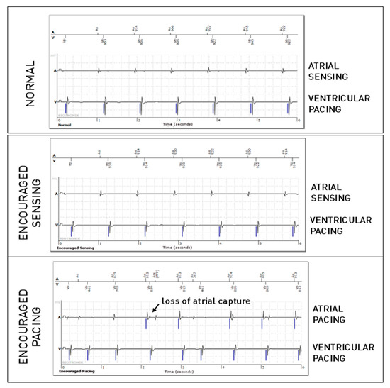 Out of the 5543 periodic EGMs including an atrial lead, 359 episodes revealed an atrial lead anomaly (6.5%), of which only 149 were observed during the passive mode. No significant difference was observed regarding atrial undersensing between these modes, while trends suggested more undersensing during Encouraged Sensing and less during Encouraged Pacing. Regarding far-field ventricular oversensing on the atrial lead, compared to the normal mode, significantly more anomalies were found in Encouraged Sensing (p < 0.001), and significantly fewer anomalies were found in Encouraged Pacing (p < 0.001). This can be explained by the fact that these oversensing anomalies are much more frequent with spontaneous ventricular activity than after paced ventricular activity. There were also significantly more cases of atrial oversensing due to lead dysfunction during Encouraged Pacing (p < 0.001). We have no certain explanation for this phenomenon, but we speculate that the tension applied to the circuit during atrial stimulation may promote the appearance of over-detected noise on the defective atrial lead. Finally, more cases of loss of atrial capture were detected during Encouraged Pacing when compared with the passive mode (p < 0.0001). Figure 2 shows an example of loss of atrial capture that was not visible during the passive (normal) mode, as there was no atrial pacing, but was unmasked by the active mode (Encouraged Pacing).