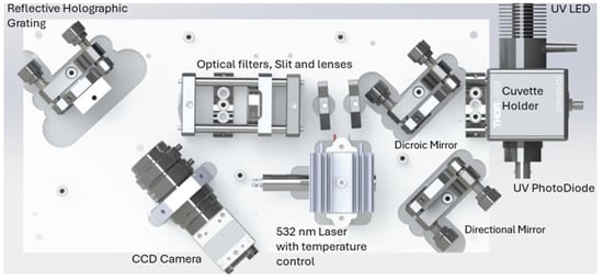 The baseplate was fabricated from an aluminum plate using computer numerical control (CNC) machining, according to the distances and dimensions specified on the OpenRAMAN platform. The cuvette holder used in the system is the CVH100/M model, chosen for its versatility, allowing the integration of various analysis techniques to examine the same sample.