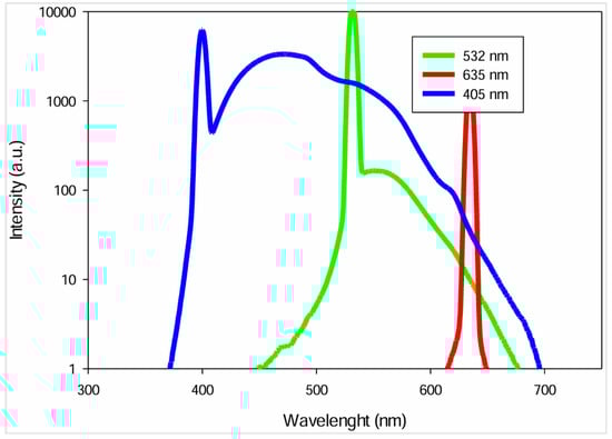The main factors to take into consideration in laser selection are wavelength and emission range. To identify the optimal wavelength for Raman analysis, urine’s fluorescence emission was quantified under irradiation at various wavelengths using the FP-8300 spectrofluorometer from JASCO Corp, Tokyo, Japan. One sample of urine was irradiated with three wavelengths: 405 nm, 532 nm and 635 nm. These wavelengths were chosen to evaluate the urine’s fluorescent response across a wide range.