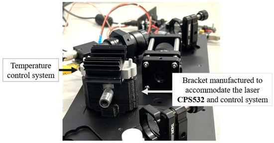 A custom support structure to accommodate the CPS532 laser and its control system was fabricated using 3D printing/milling processes. A Peltier element in the setup ensures the heat transfer between the laser module and a dissipator. A picture of the laser support is reported in Figure 3.