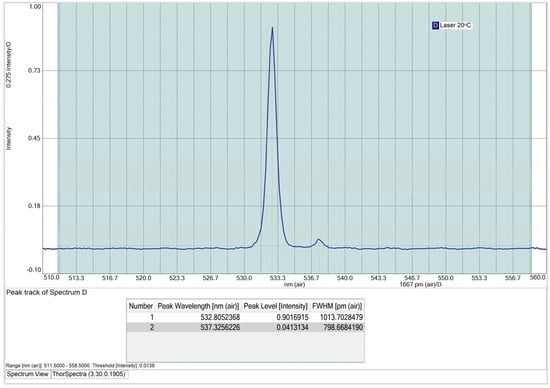 At an operating temperature of 20 °C (cf. Figure 5), the CPS532 laser spectrum exhibits two peaks: a primary peak at 532.8 nm, with an intensity of 0.90 and an FWHM of 1013.7 pm, and a secondary peak at 537.3 nm, with an intensity of 0.04. The secondary peak is attributed to the use of the SMA905 optical fiber, which, despite introducing this interference, is essential for ensuring the reproducibility and comparability of the results. Notably, the optical fiber will not be used for Raman spectra acquisition, so this interference will not affect the quality or accuracy of the spectra obtained with the system.