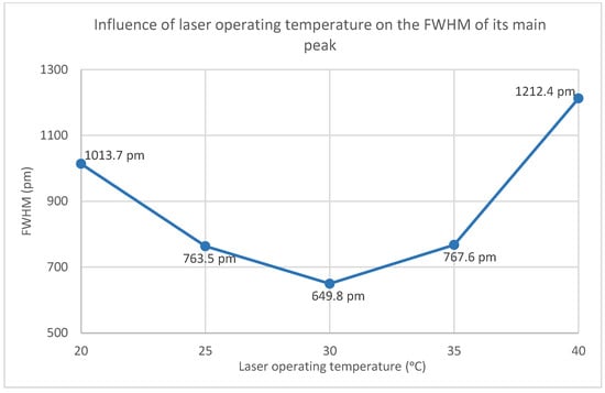 Subsequently, the laser’s operating temperature was varied to 25 °C, 30 °C, 35 °C and 40 °C, with the obtained spectra presented in Appendix A. Figure 6 illustrates the variation in the FWHM as a function of the laser’s operating temperature.