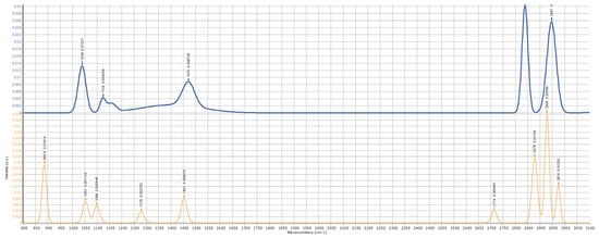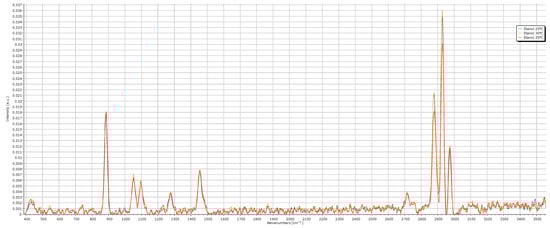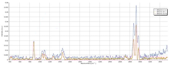 In a second phase, the spectrum of ethanol (chemical formula: CH3CH2OH) was acquired using the developed Raman system at three different laser operating temperatures: 25 °C, 30 °C and 35 °C (cf. Figure 7). The main objective of this phase was to assess how the laser’s operating temperature influenced the quality and accuracy of Raman spectra. The ethanol spectrum was acquired with Spectrum Analyzer software 1.2, with the acquisition parameters reported in Table 1. The visualization of the spectrum obtained was performed using SpectraGryph software, version 1.2.