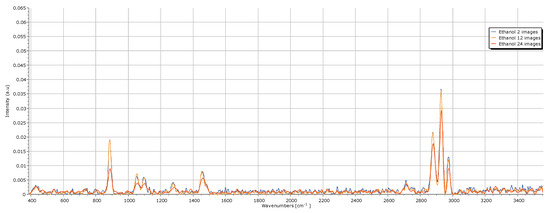 Then, the impact of the number of images acquired and combined to generate the final spectrum was evaluated; the parameters are reported in Table 3 and the obtained spectra are reported in Figure 9. The analysis of the obtained spectra reveals that when only two images are acquired, the noise is significantly higher, particularly in regions without peaks, complicating the analysis of more complex spectra, such as urine spectra. Increasing the number of images to 12, the noise level in these regions decreases considerably while preserving the intensity of ethanol’s characteristic peaks. This provides the highest SNR ratio, as it minimizes noise while maintaining distinct peaks. Acquiring spectra with a higher number of images resulted in a similar noise level in the regions without peaks. However, the intensity of the peaks reduced considerably. Therefore, we conclude that the average number of images that improve the overall quality of the spectrum while maintaining a high SNR ratio is 12 images.