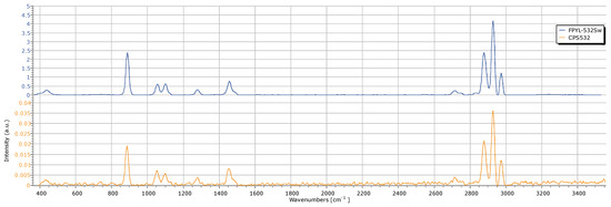 The differences between the spectra are notable, with the higher-powered laser providing a substantial enhancement in the intensity of the Raman peaks, lower noise and shorter acquisition times. Using the CPS-532 laser, the maximum intensity achieved was only 0.035, which was notably lower. In contrast, the FPYL-532 laser allows for intensities to reach up to 4, representing a remarkable improvement. This enhancement directly improves the quality and clarity of the obtained data, highlighting the critical role of laser power in Raman spectroscopy analyses.