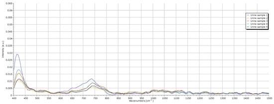 To validate the developed system for urine spectra acquisition, its performance was evaluated in this context. The focus of this evaluation was not to identify the biomarkers present in the urine, nor to conduct their detailed analysis, but to ensure that the Raman system is able to acquire urine spectra with precision and consistency. For this purpose, five samples of urine were used. The acquisition parameters used are described in Table 4, and the spectra are reported in Figure 11.
