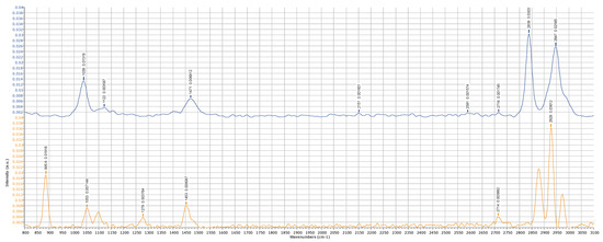 Raman spectrum of methanol (blue line) and ethanol (orange line). The data are filtered with a Gaussian convolution algorithm for noise removal.