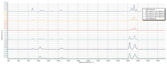To train the model, Raman spectra of six methanol–ethanol solutions with different compositions were acquired. The decision to use methanol–ethanol solutions was based on the fact that they generate simpler Raman spectra. This characteristic facilitated the initial development and optimization of the algorithm, as it allowed us to evaluate the model’s ability to classify straightforward Raman signals before progressing, in the future, to more complex biological samples.