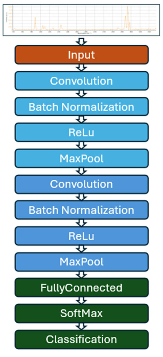 The learning model was developed using MATLAB Version 2023, and it is a Convolutional Neural Network (CNN) tailored to classify Raman spectra.