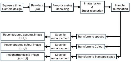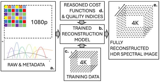 - Another approach is to have one single optimized block that encapsulates the whole imaging pipeline, where effective parameters may not have any meaningful semantic meaning. This set of parameters could be determined by an optimizer that takes raw spectral data and their metadata as input and provides a full-resolution HDR hyperspectral image. This is what is illustrated in Figure 4.