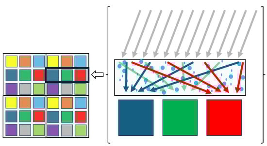 - SFA technology [26,53,54]: It employs a filter array to sample the spectral dimension. It attracted great interest in the imaging community since its concept is very close to that of a colour filter array (CFA) (see Figure 4). In fact, this technique is a generalisation of its colour pendant that trades spatial resolution for spectral resolution. The traded spectral resolution is usually compensated for by a demosaicing algorithm. Its limitation, specifically its resolution, has been addressed through the fusion of a colour image with an SFA image [55]. The current evolution of SFA is related to improvements in the filtering process. We can select filters based on nano-technologies. The nanometric control of matter would allow for several opportunities, such as nanowires for the better control of bandpass [56]. In addition, reconfigurable filters [57] would allow for an increase in spectral resolution but would come at the expense of the temporal dimension.