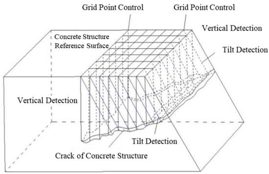 The trapezoidal support (gate) pier is segmented into two detection areas for data acquisition based on particle detection: the vertical detection area and the inclined detection area, separated by the top boundary of the trapezoidal pier. In the vertical detection area, grid points (e.g., A0, A1, B0, B1) are established on the top surface (aisle) of the support (gate) pier, with these points serving as base points for the particle beam wave meter. Vertical downward detection is conducted, and the collected data are labeled sequentially as A0, A1, B0, B1, and so on. In the inclined detection area, the same grid points (e.g., A0, A1, B0, B1) on the top of the pier are used as base points. Signals are emitted parallel to the inclined plane of the trapezoidal body, set at a 59° angle, to perform oblique distance detection of cracks. The data collected in this area are recorded as A0’, A1’, B0’, B1’, and so forth, as illustrated in Figure 12.