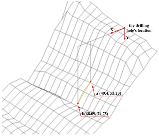 Based on the 3D visualization results of concrete cracks, the accuracy and alignment of crack characteristic parameters detected by the quantitative particle method were preliminarily assessed. Using Pier 1# of the Yingxiuwan Hydropower Plant’s water diversion dike as an example, verification was conducted to confirm whether the identified crack coincided with its location in the three-dimensional model. According to the core drilling results, the concrete sample labeled 4# from Pier 1# measured 28.5 cm in length and 75.30 cm in depth along the drilling hole. Taking the drilling hole’s location as the origin of coordinates, with the horizontal leftward direction as the positive X-axis and the vertical downward direction as the positive Y-axis, the coordinates at the two ends of the 4# concrete sample were determined to be (49.4, 53.23) and (68.09, 74.75).