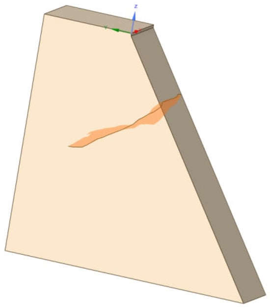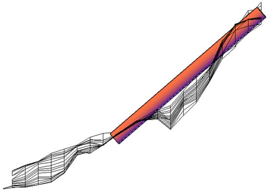Based on the crack detection measurement data, the three-dimensional coordinates derived from the crack geometry data were imported into CAD. The spatial points were sequentially connected to create a three-dimensional complex surface comprising multiple smaller surfaces. This constructed 3D crack surface was then imported into ANSYS, where the complex surface was unified into an independent three-dimensional surface. Using this process, a three-dimensional spatial crack visualization system was established for Pier 1# of the Yingxiuwan Hydropower Plant’s support structure and Pier 2# of the Yuzixi Hydropower Plant’s spillway structure, as illustrated in Figure 13 and Figure 14.